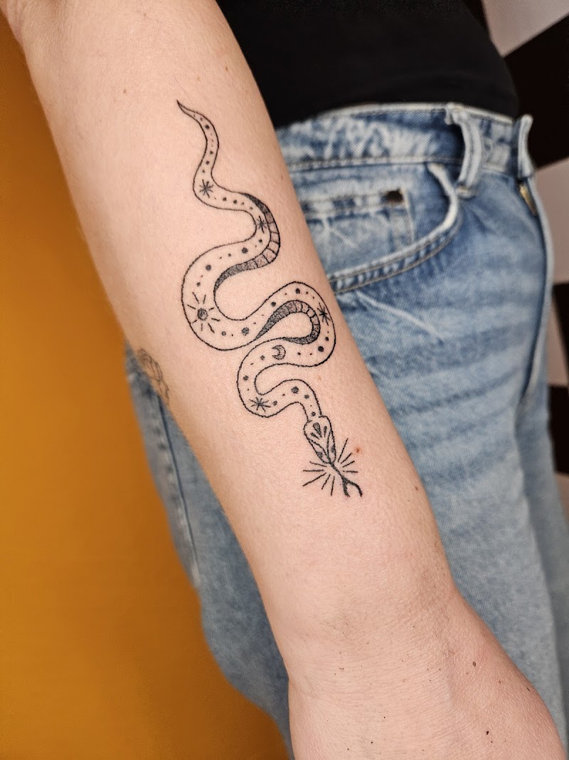 Fineline slang met sterren en maan op onderarm.