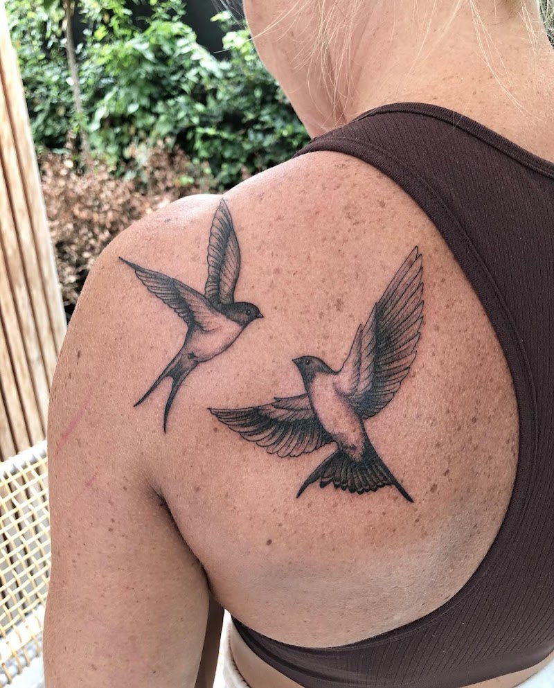 Twee gedetailleerde vliegende zwaluwen op het schouderblad.