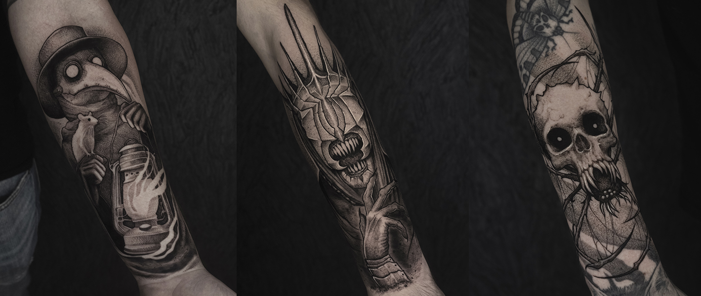 Collage van drie duistere blackwork tattoos: pestdokter, Sauron, schedelspin.