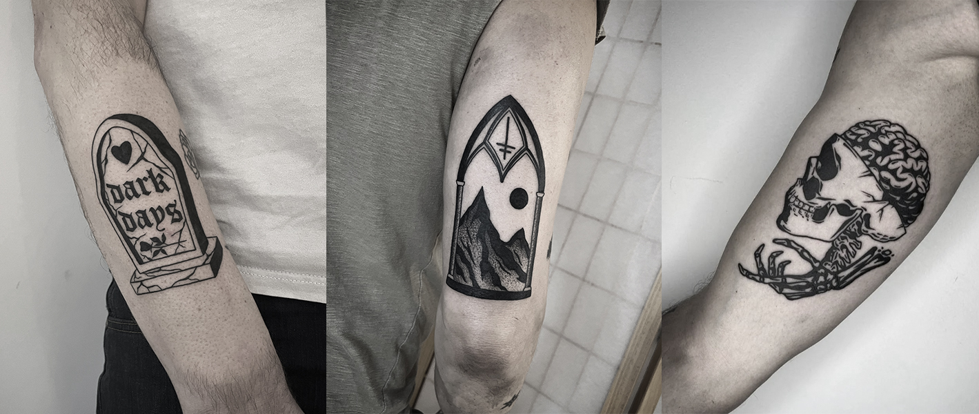 Collage van drie blackwork tattoos: grafsteen, gotisch raam en schedel met brein.