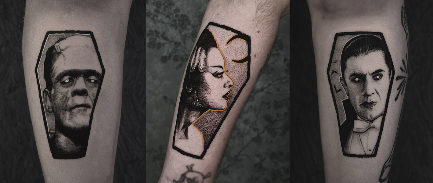 Drieluik van Frankenstein, Bride en Dracula in doodskisten, blackwork stijl.