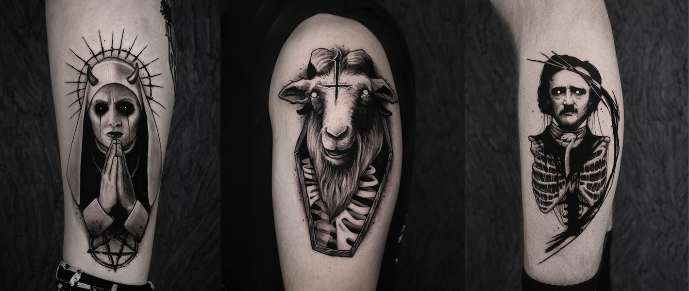 Collage van drie duistere blackwork tattoos: non, geit en Edgar Allan Poe.