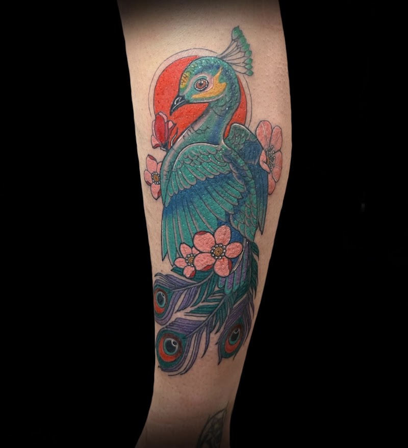 Kleurrijke pauw met bloemen en rode zon op onderbeen.