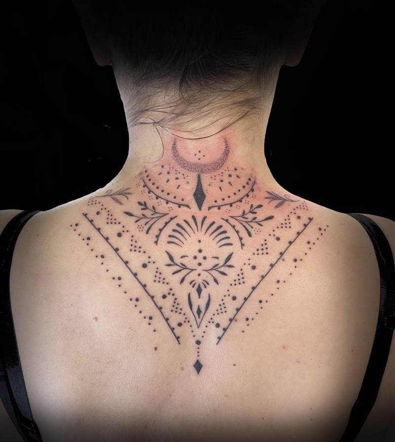 Ornamentele dotwork en lijnwerk tattoo op nek en bovenrug.