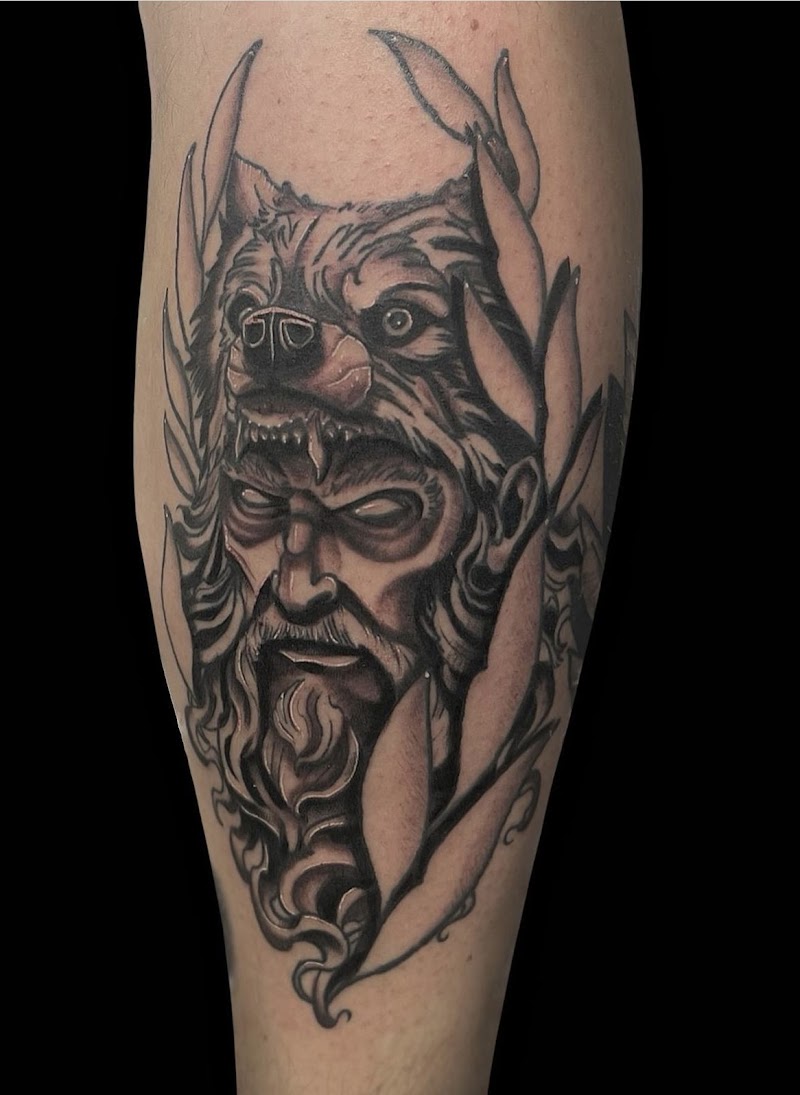 Man met baard en wolvenkop hoofdbedekking, omringd door bladeren.