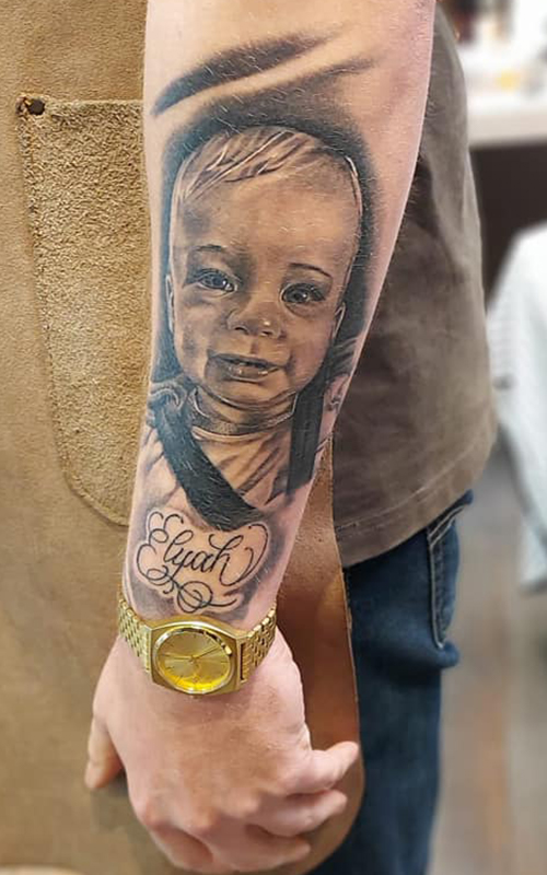 Realistisch portret van een baby met de naam 'Elyah' in sierletters op de onderarm.