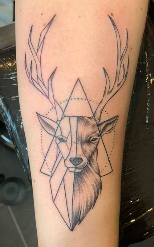 Geometrisch en realistisch hertenhoofd met driehoek op onderarm.