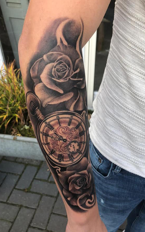 Zwart-wit half-sleeve tattoo met rozen en een gedetailleerd zakhorloge.