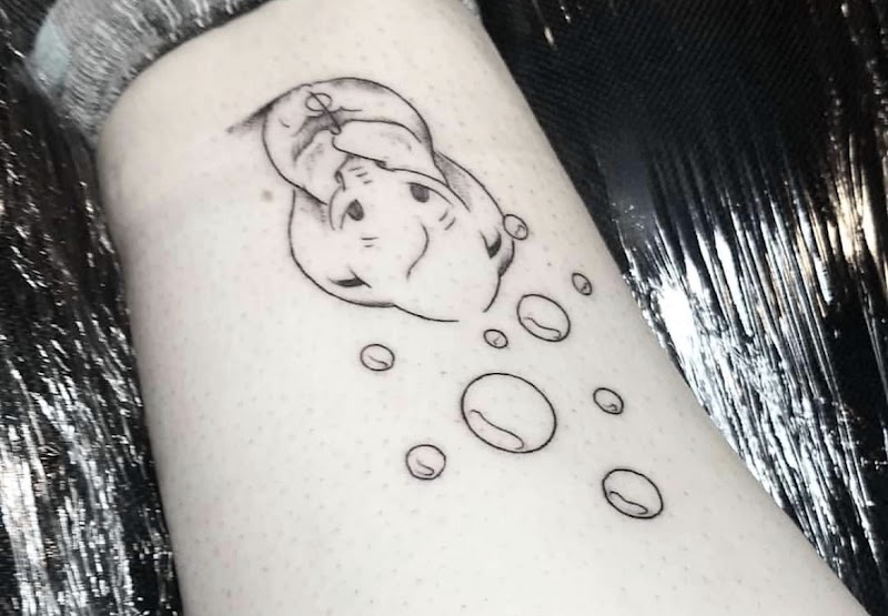 Schattig nijlpaard dat bellen blaast, fineline stijl op de enkel.