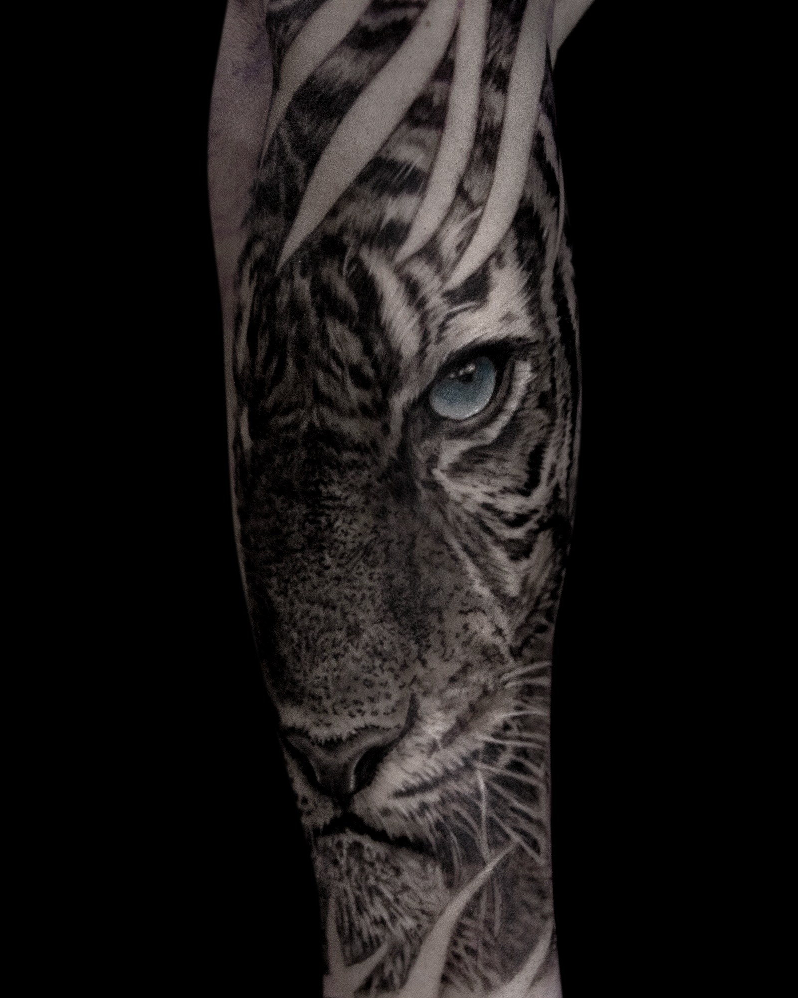 Realistische tijger met blauw oog op onderarm.