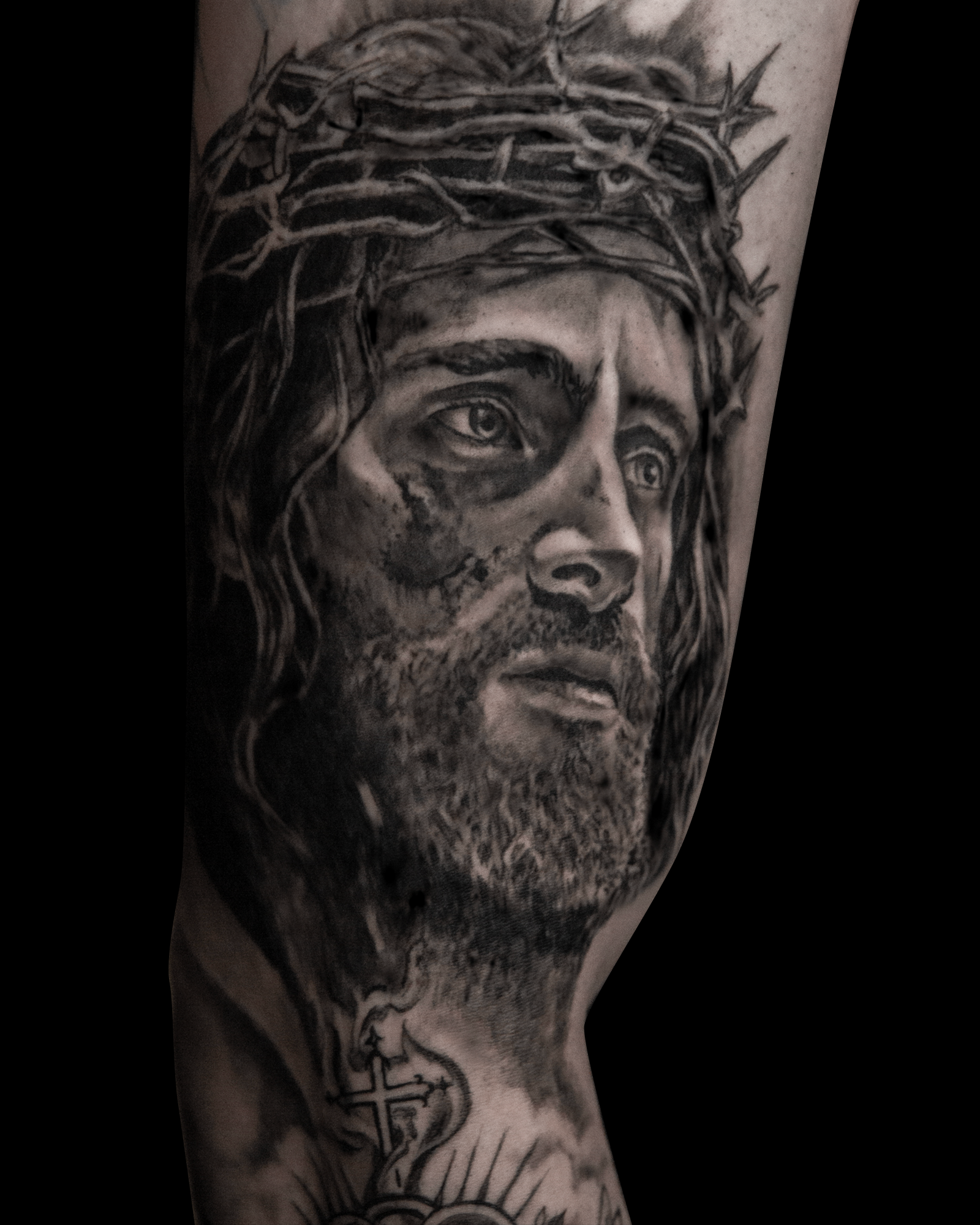 Realistisch portret van Jezus met doornenkroon op bovenarm.