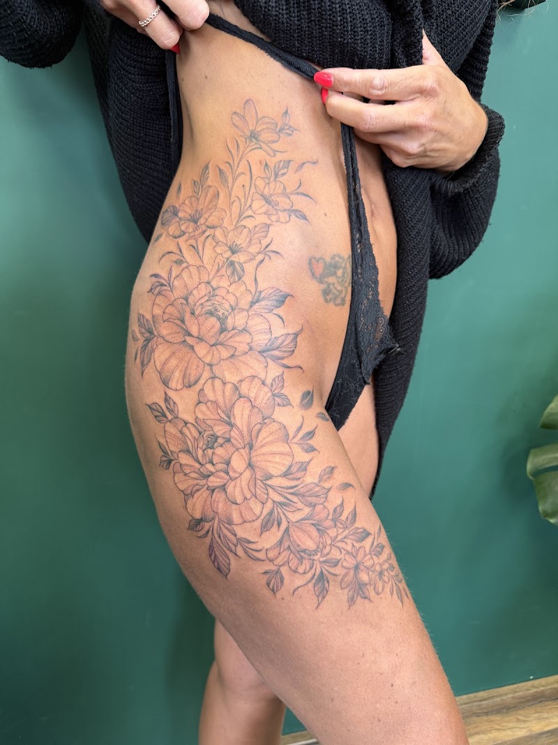 Grote fineline bloemen tattoo op heup en bovenbeen.