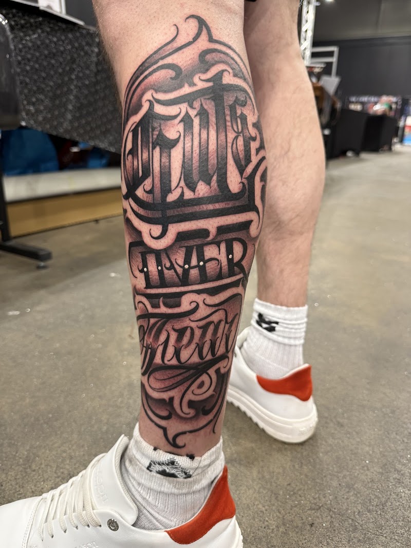 Grote 'Guts Over Fear' lettering tattoo op kuit.