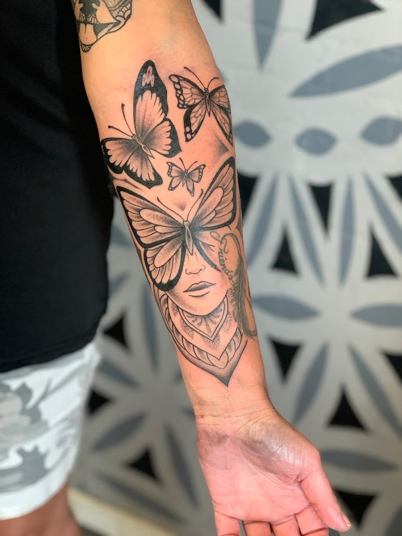 Zwart-wit tattoo van een vrouwengezicht met vlinders en een veer op de onderarm.