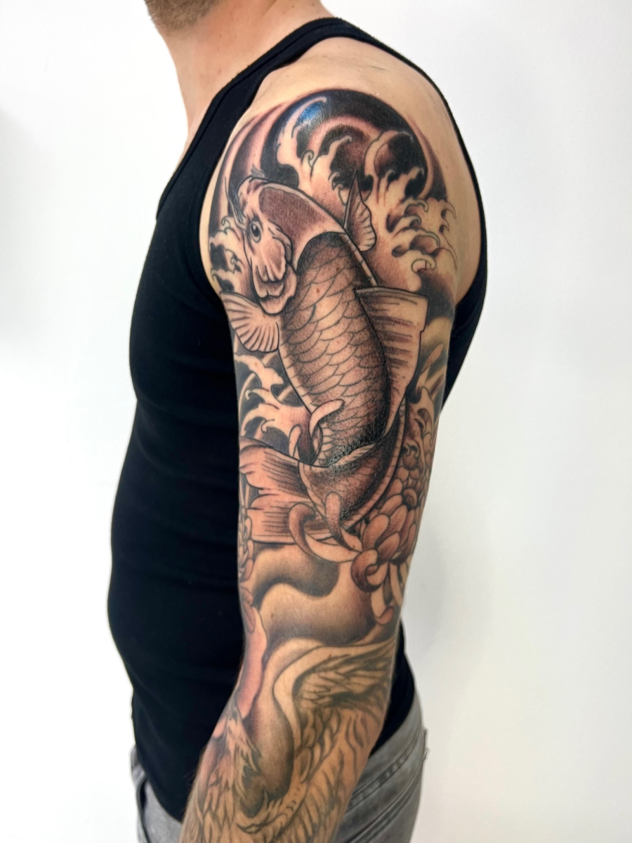 Zwart-wit Japanse koi karper en golven op bovenarm.