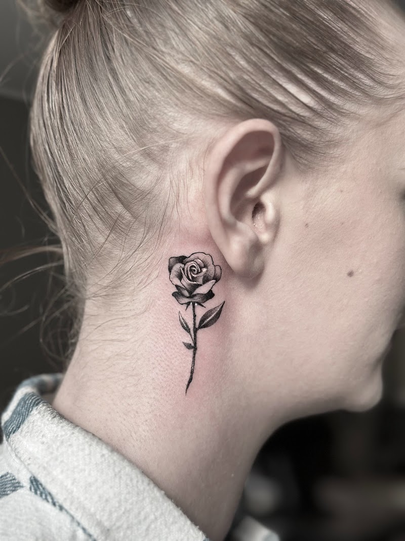 Kleine, gedetailleerde roos tattoo achter het oor.