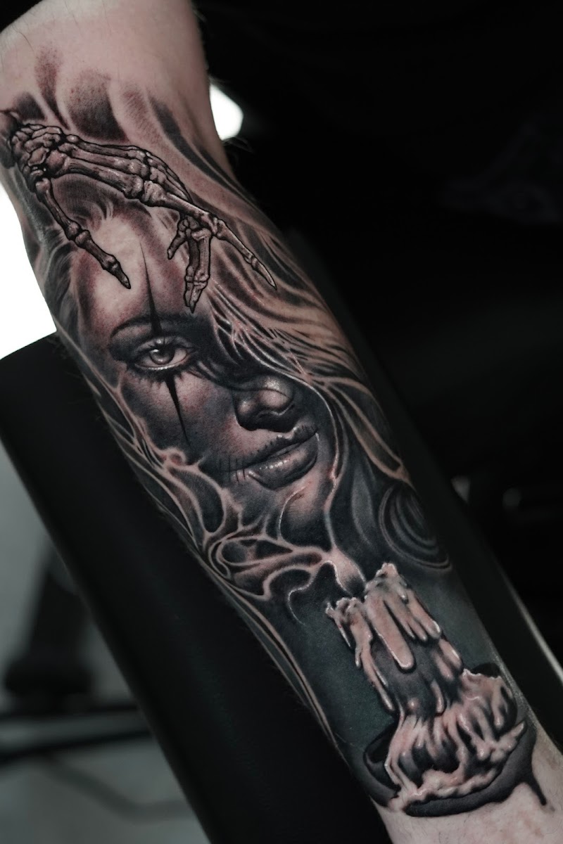 Black and grey tattoo van een vrouwengezicht, skelet hand en smeltende kaars.