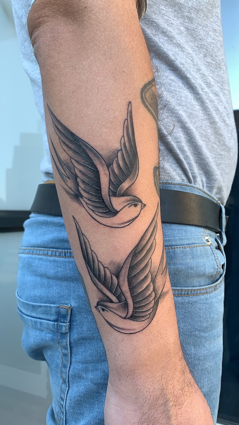 Twee traditionele zwaluwen in zwart-wit op de onderarm.
