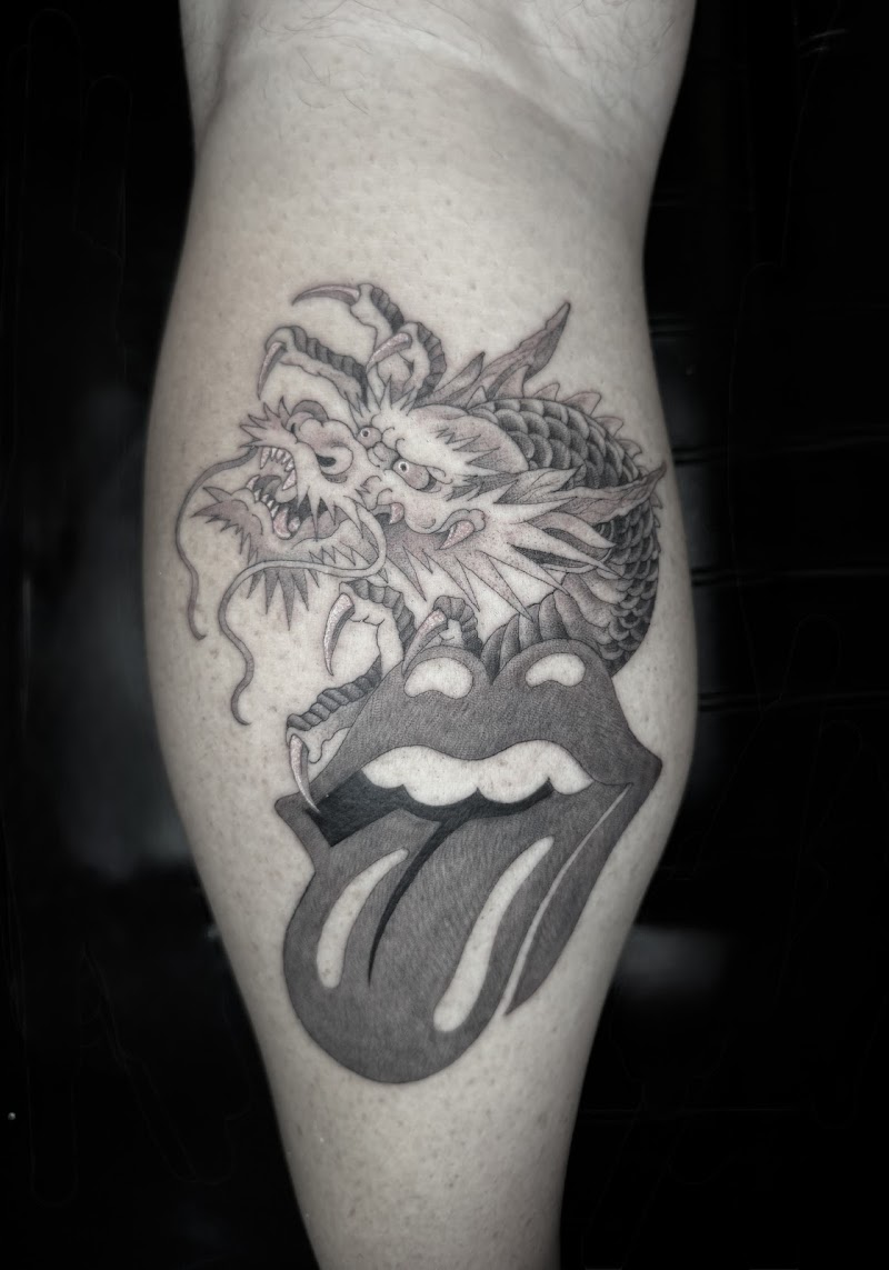 Zwart-wit tattoo van een Japanse draak gecombineerd met het Rolling Stones tong logo.