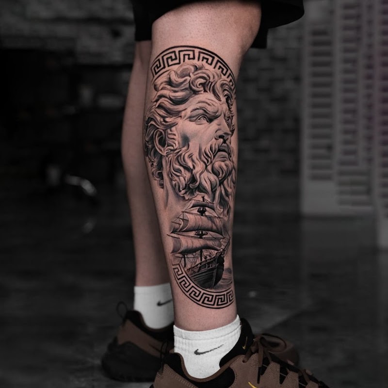 Realistische Poseidon en schip tattoo op onderbeen.