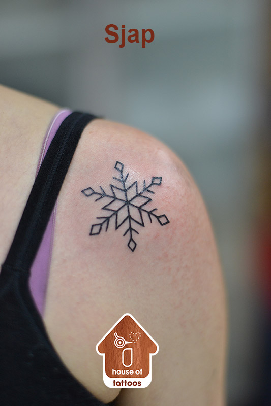 Kleine, minimalistische sneeuwvlok tattoo op de schouder.