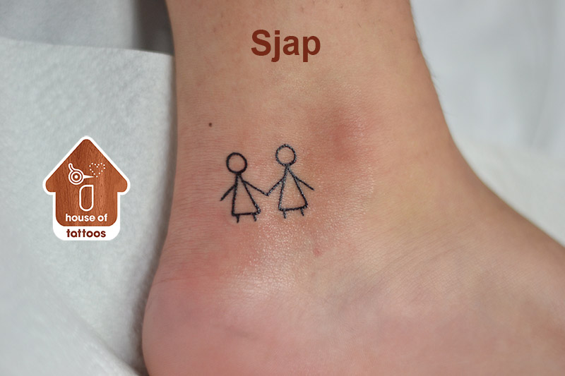 Kleine minimalistische tattoo van twee stokfiguurtjes die elkaars hand vasthouden op de enkel.