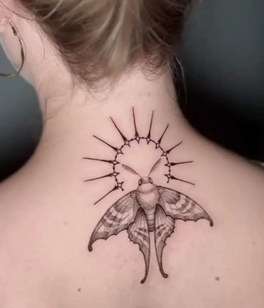 Kleine, minimalistische vlinder tattoo op de bovenarm.