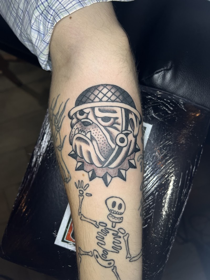 Traditional bulldog hoofd met helm en een simpele skelet tattoo.