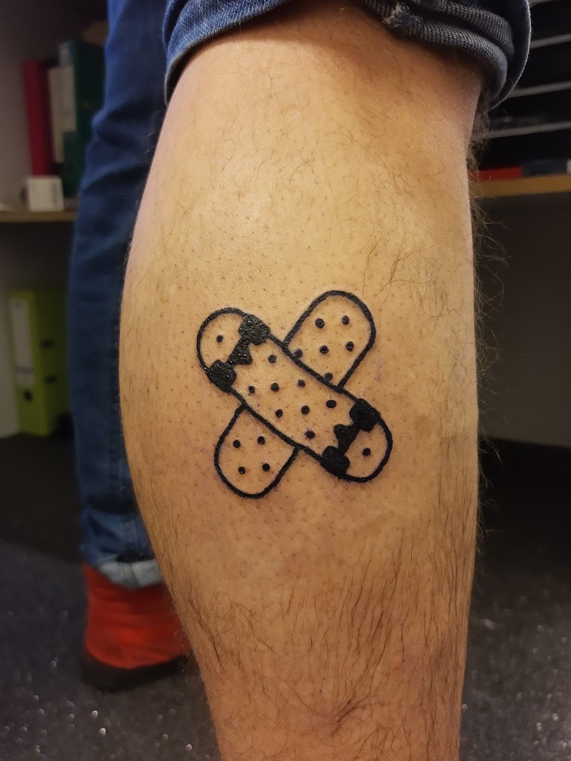 Illustratieve tattoo van twee gekruiste pleisters op het onderbeen.