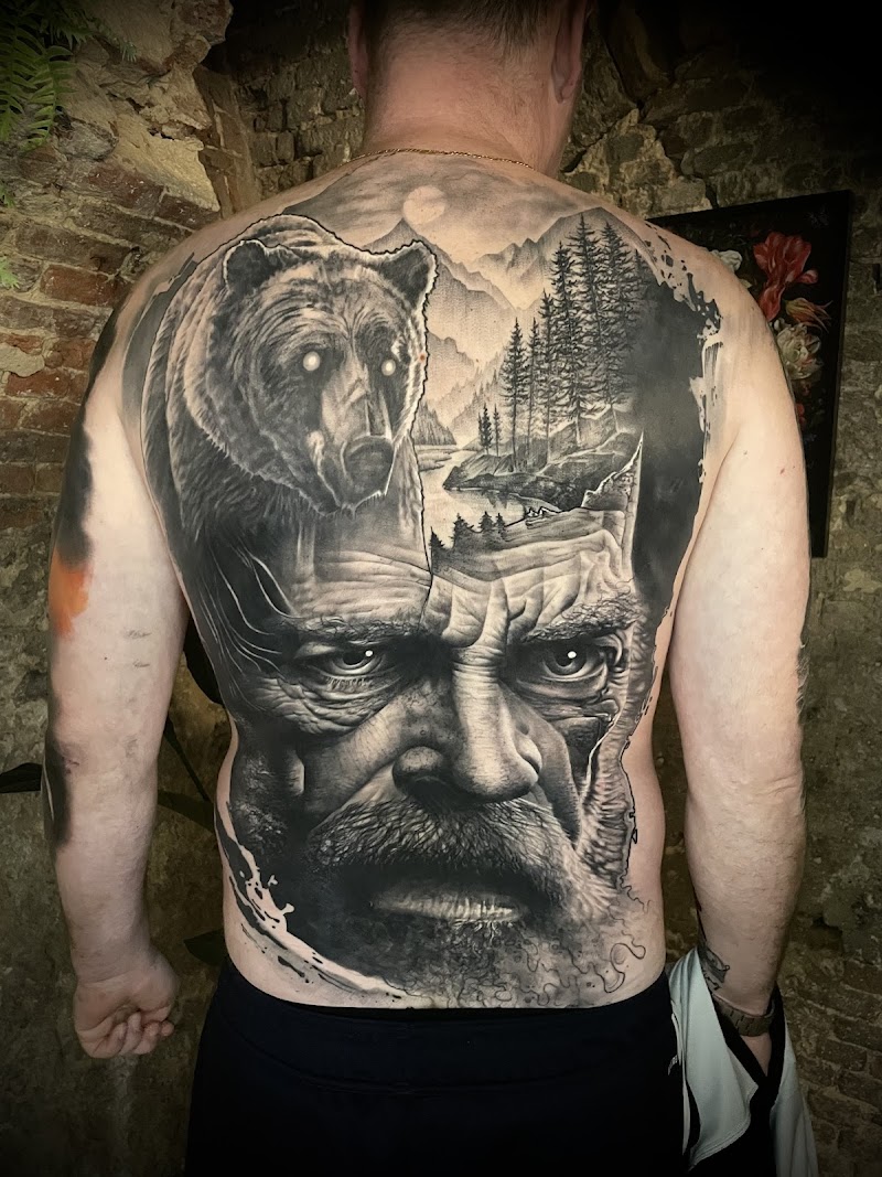 Realistische full-back tattoo van een beer, een mannengezicht en een berglandschap.