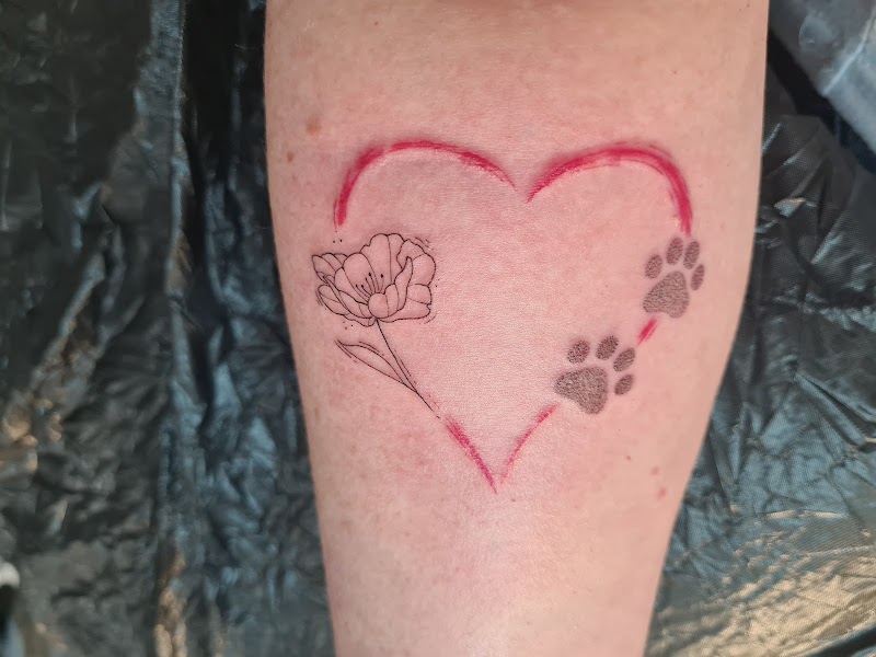 Rood hart met fineline bloem en pootafdrukken op onderbeen.