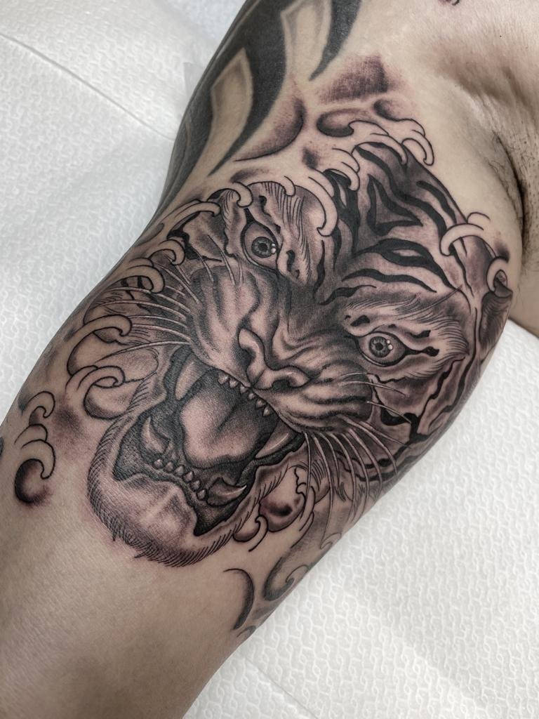 Zwart-wit tijgerkop met Japanse golven op de bovenarm.