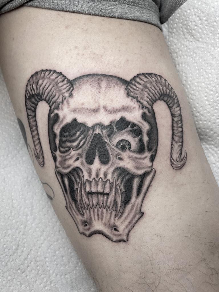 Zwart-wit schedel met hoorns en een oog in de oogkas.