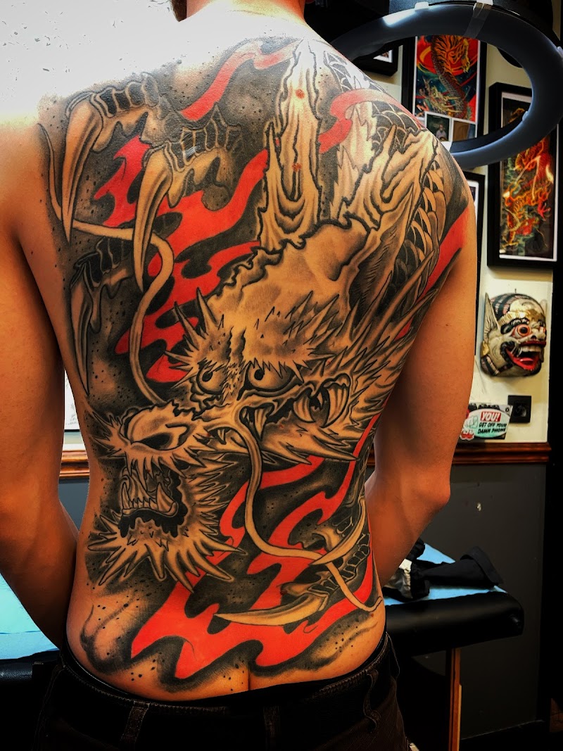 Grote Japanse draak tattoo op de volledige rug, zwart-grijs met rode accenten.