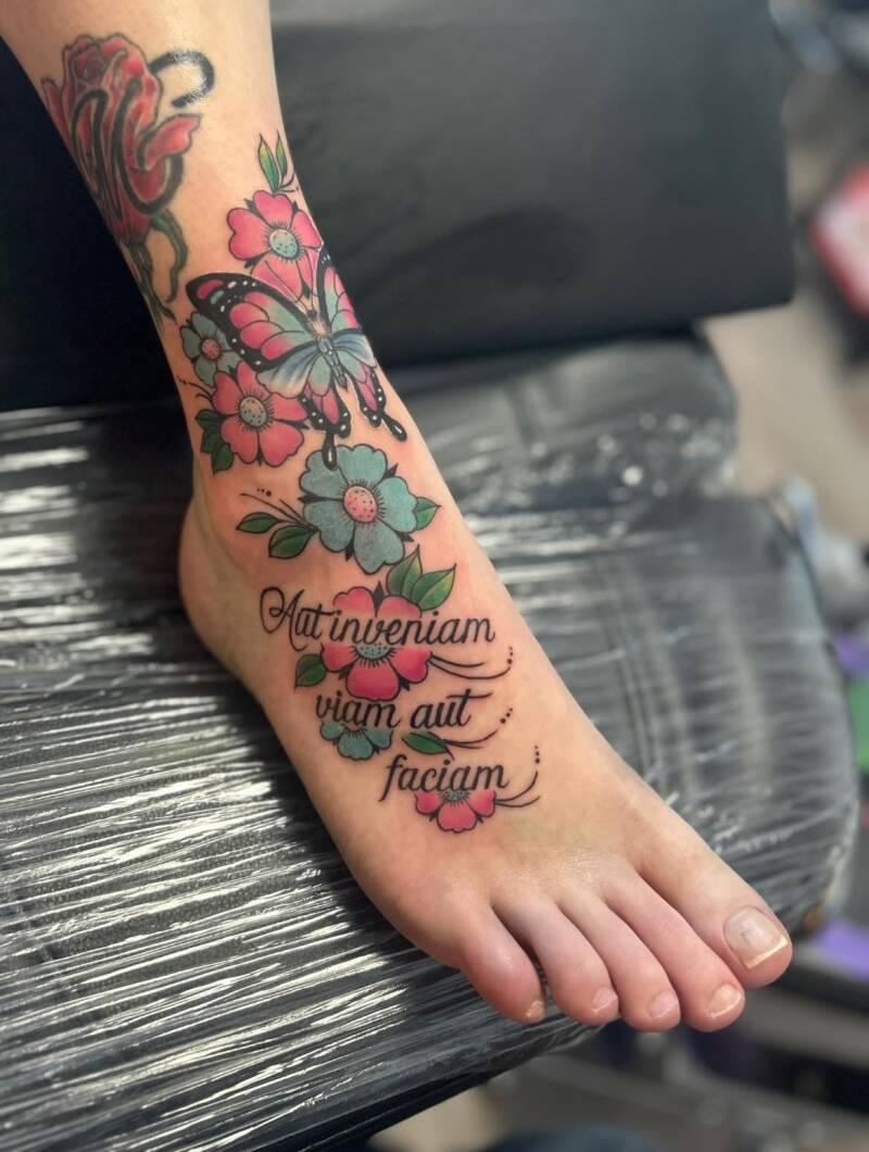 Kleurrijke bloemen, vlinder en Latijnse tekst op voet en enkel.