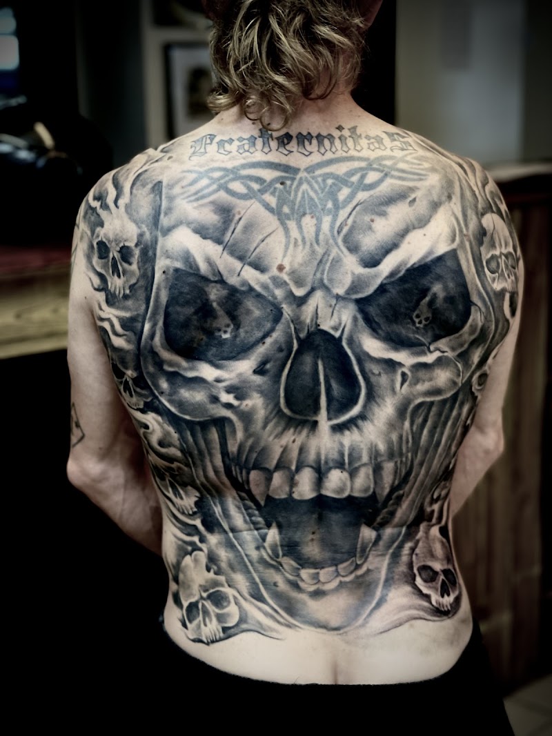 Grote zwart-wit schedel full-back tattoo met 'Fraternitas' tekst.