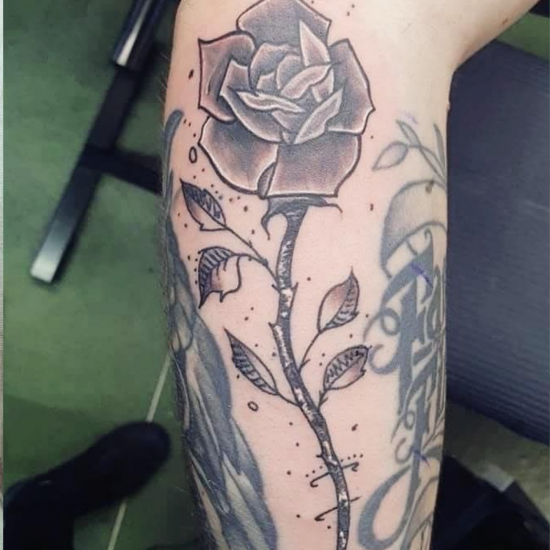 Zwart-wit roos tattoo met steel en bladeren op de onderarm.