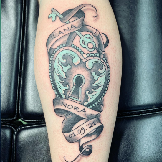 Neo-traditional hartslot met sleutel, namen Ilana, Nora en datum.