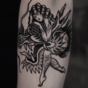 Blackwork tattoo van een vrouw die een draak omhelst, op de onderarm.