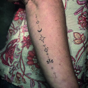Minimalistische fineline tattoo met maan, sterren en stippen op onderarm.