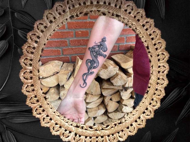 Zwart-wit tattoo van een slang die om een dolk kronkelt op de onderarm.