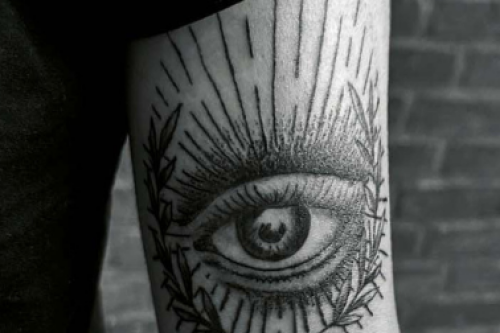 Zwart-wit tattoo van een oog met stralen en lauwerkrans op de bovenarm.