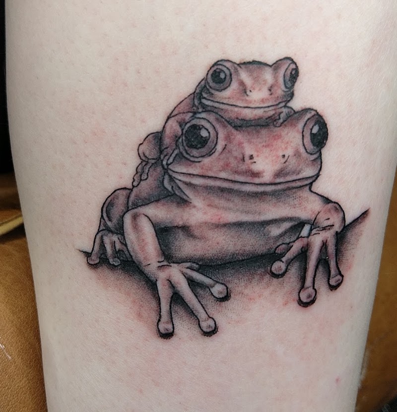 Close-up van twee kikkers op elkaar, zwart-wit.