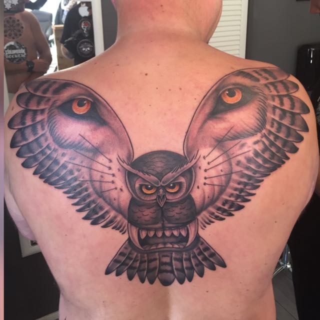 Grote uil met gespreide vleugels en felle oranje ogen op de bovenrug.