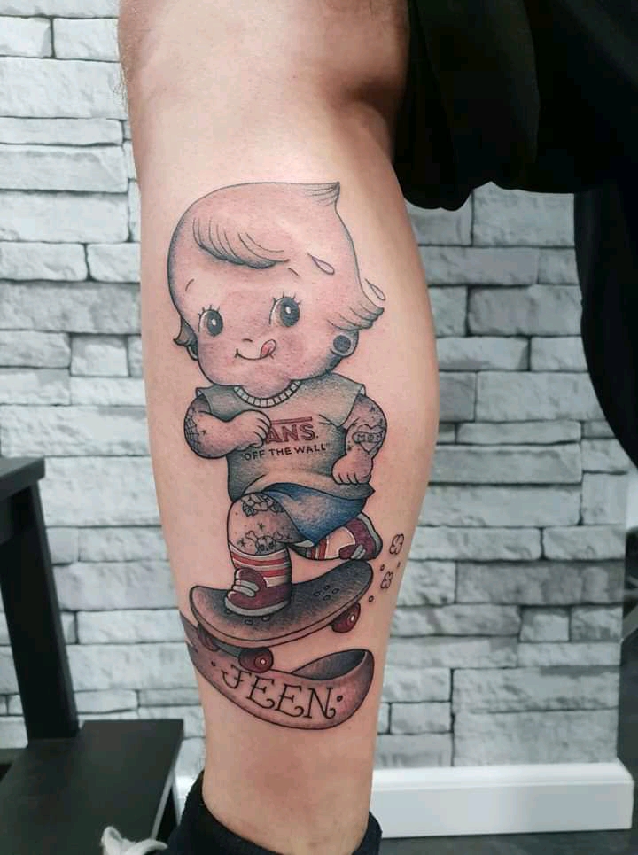 Traditionele Kewpie pop op skateboard met Vans shirt en naam JEEN.