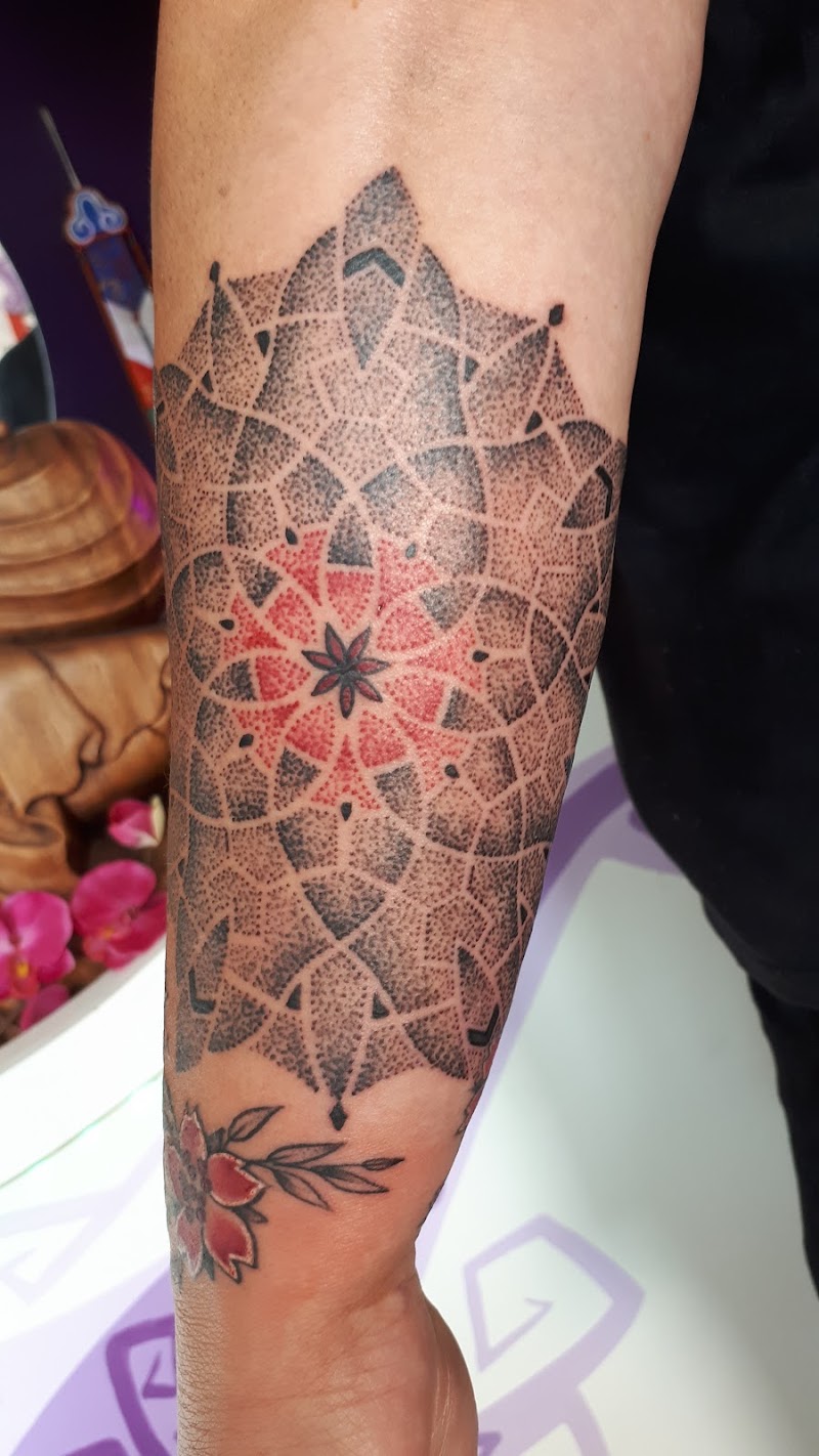 Tribal tattoo op bovenarm met rode accenten en een bloem.