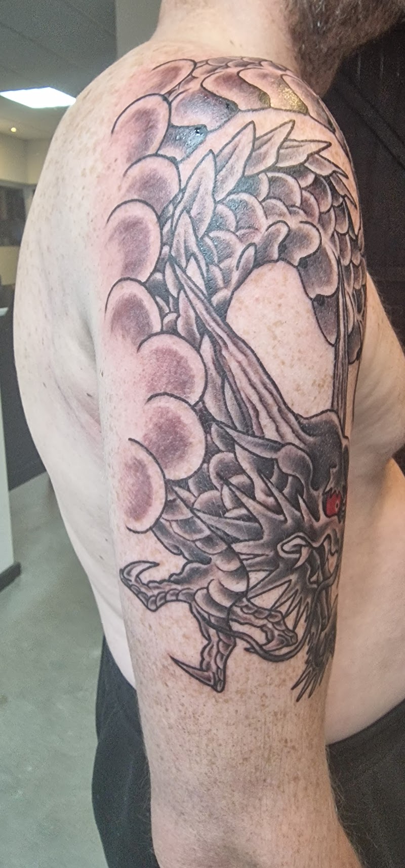 Zwart-grijze draak met rode kersenbloesem in watercolor stijl op onderarm.
