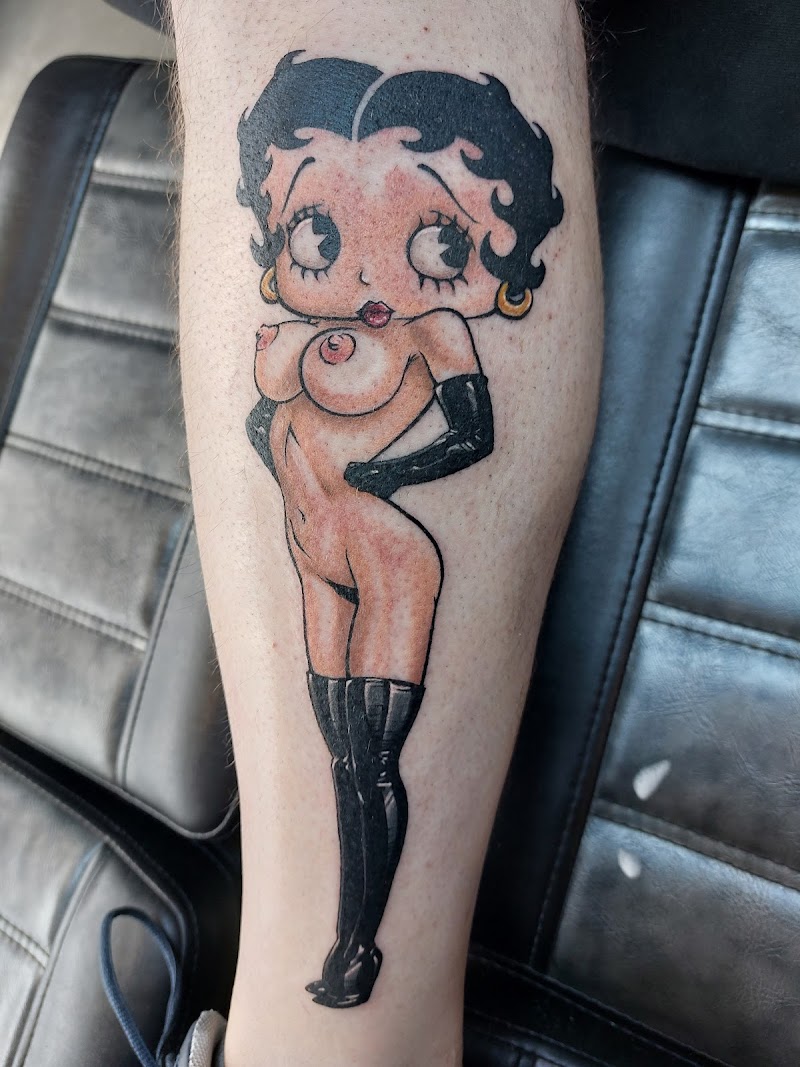 Close-up van een kleuren tattoo van een naakte Betty Boop op het onderbeen.