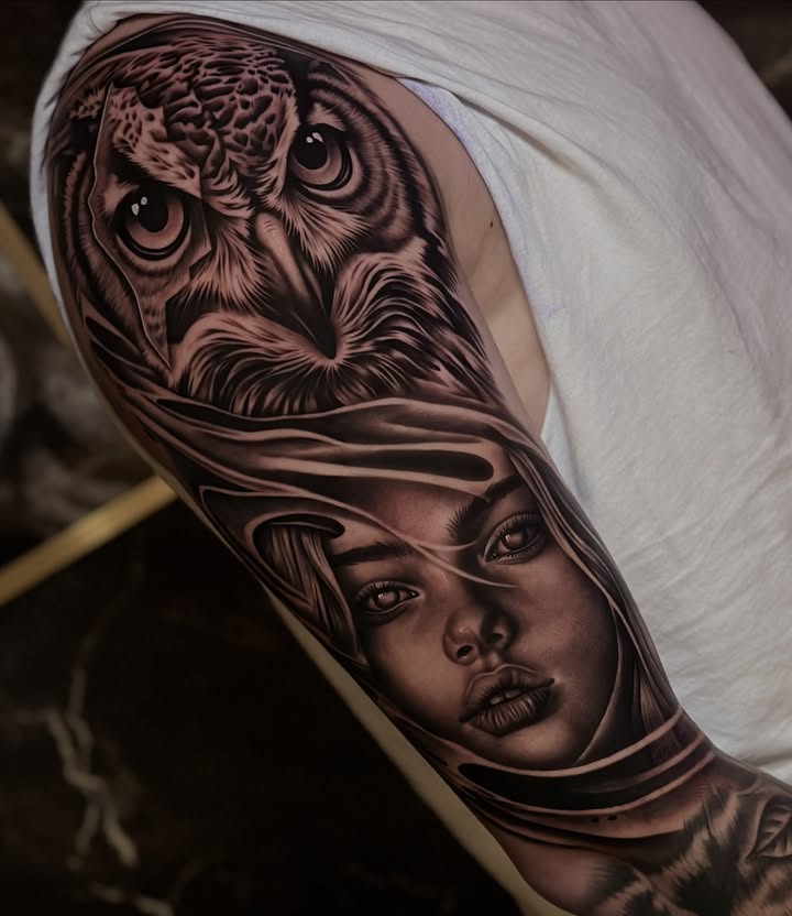 Realistische zwart-wit tattoo van een uil en een vrouwenportret op de bovenarm.