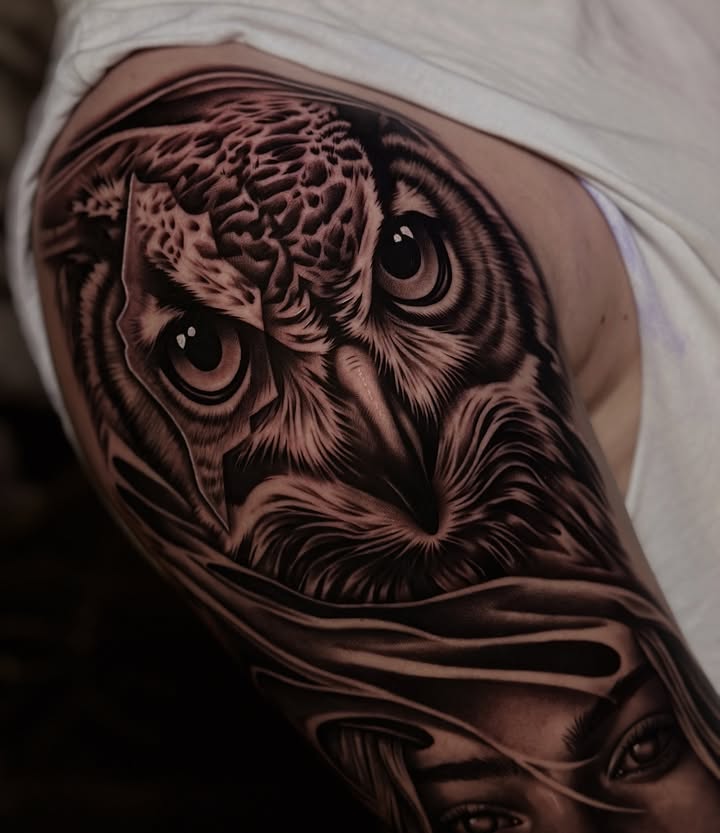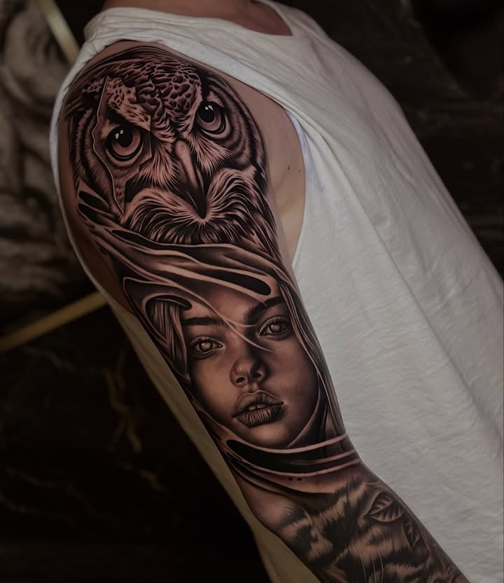 Realistische uil en vrouwenportret tattoo op bovenarm.